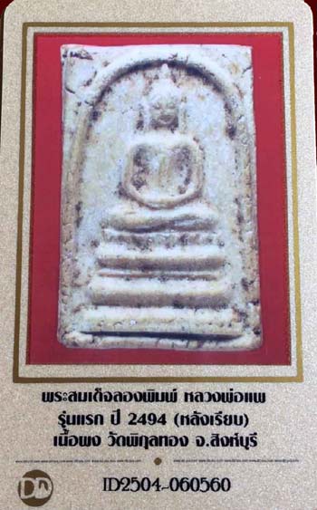 .. องค์นี้พิมพ์หลังเรียบ เนื้อหามวลสารหยาบเยอะ กดพิมพ์ได้คมชัดลึกมาก สภาพถือว่าสวยเดิมเก็บดี ไม่ผ่านการใช้ครับ เป็นของหายากมากครับ ไม่หักไม่ซ่อม พระอายุเจ็ดสิบปี ราคาน่าสะสมมากๆครับ พระยุคแรกจริงๆของหลวงพ่อแพ วัดพิกุลทอง สิงห์บุรี (แพพัน ปี๒๕๑๐ ราคายังหลักหมื่นเลยครับ)..พระมาตรฐานครับ สายตรงทราบกันดีและหาเก็บเงียบๆ (ขออนุญาตตัวอย่างบัตรรับรองให้ชมครับ)..